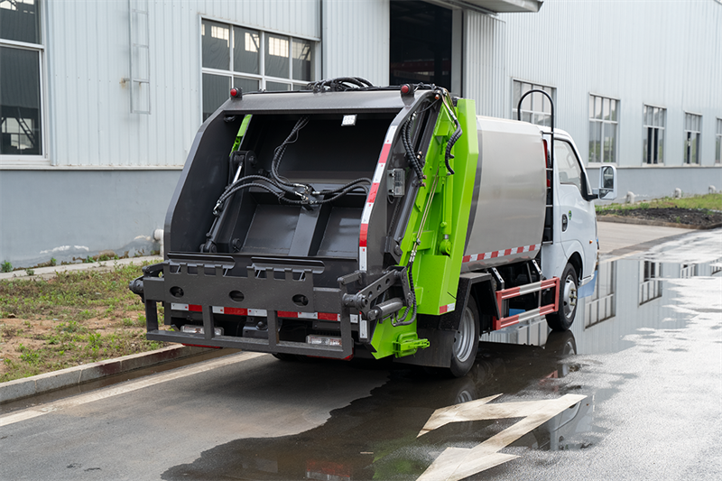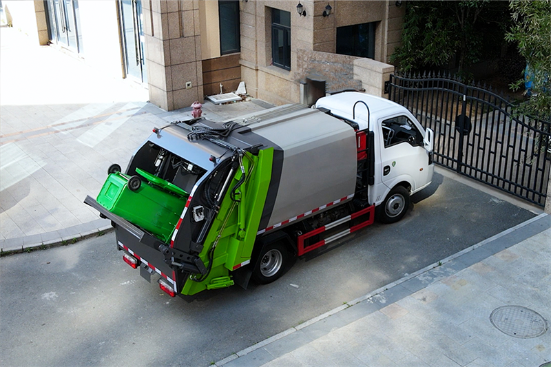 尾部翻轉(zhuǎn)板(可掛載120L和240L塑料垃圾桶),電控為CAN總線集成電路形式,手電一體,無線遙控操作!