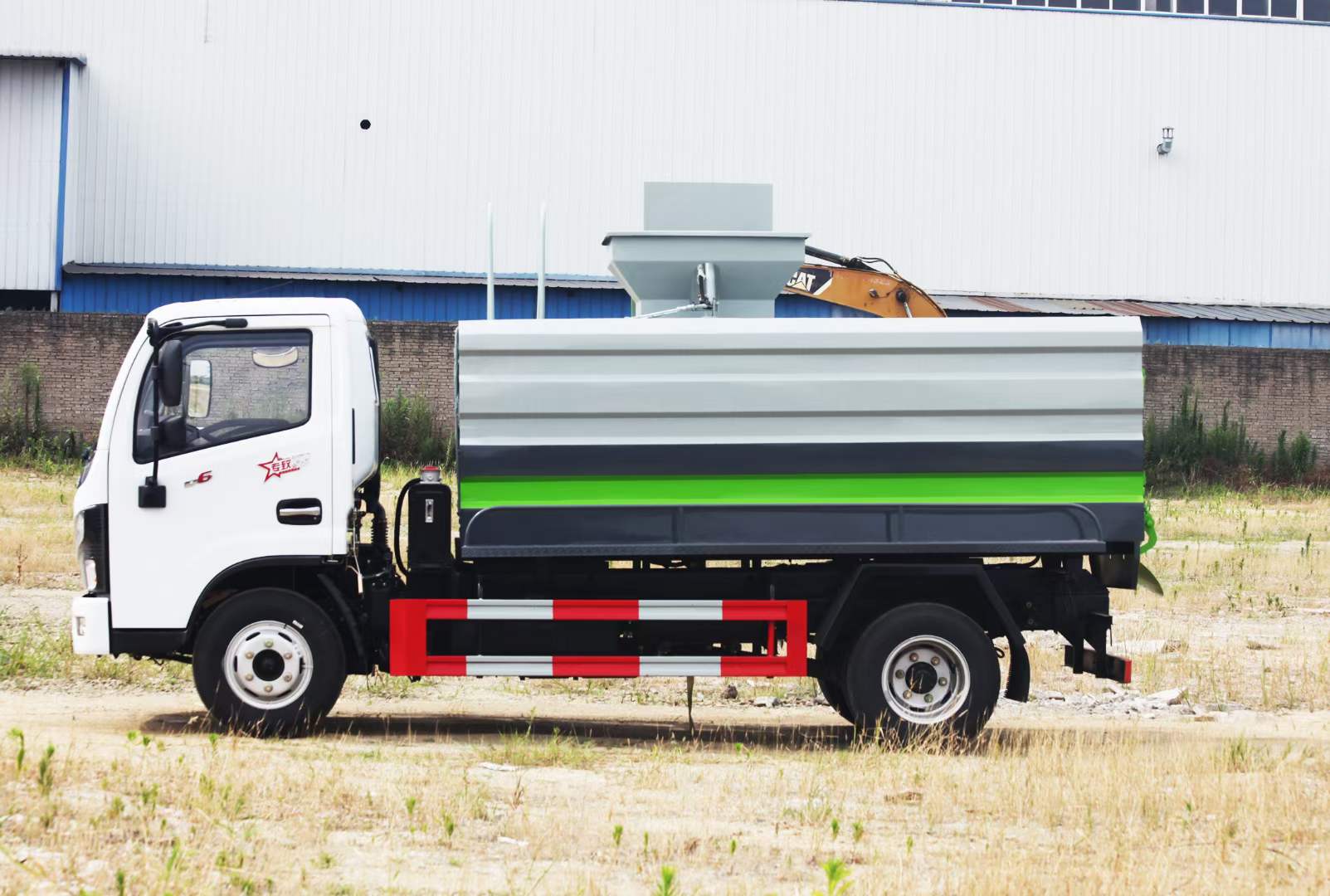 其它:箱體整體舉升自卸卸料,側方鏈條式120L或240L塑料桶提升機,箱體頂部靠尾部開50*50進料口,頂部進料口為液壓開啟,后門卸料口為液壓開啟,中梅多路閥,手動操作,可加裝加熱裝置。